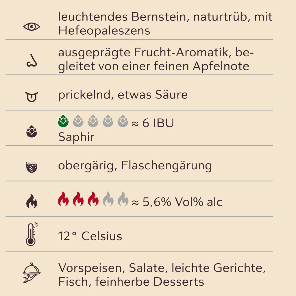 Farbe: leuchtendes Bernstein, naturtrüb, mit Hefeartopaleszenz
